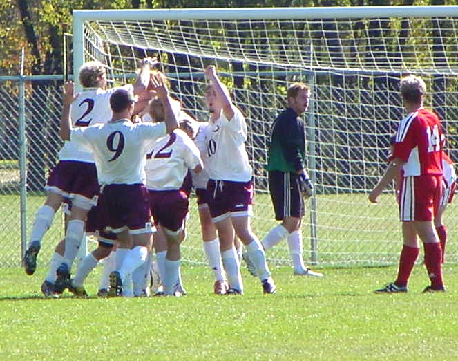 | Jason VanValkenburg (Fargo, N.Dak.) attacks the St. mary's defense off the dribble. | The Cobbers celebrate the first goal of the game just before halftime. |
