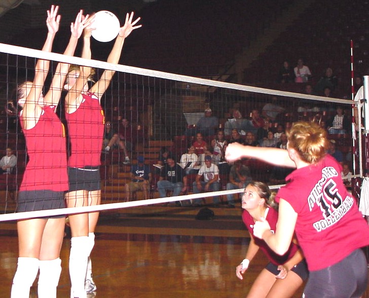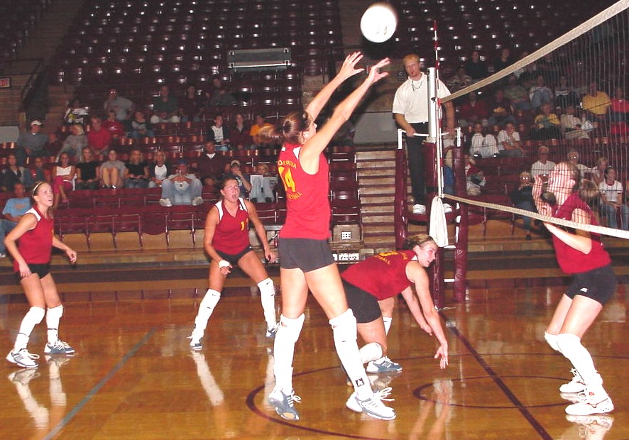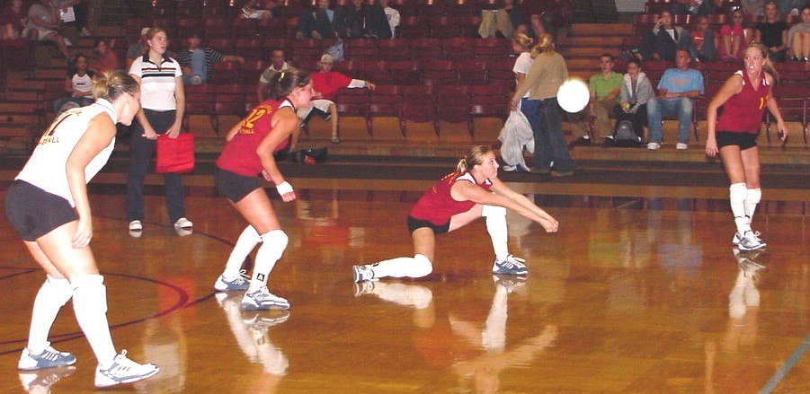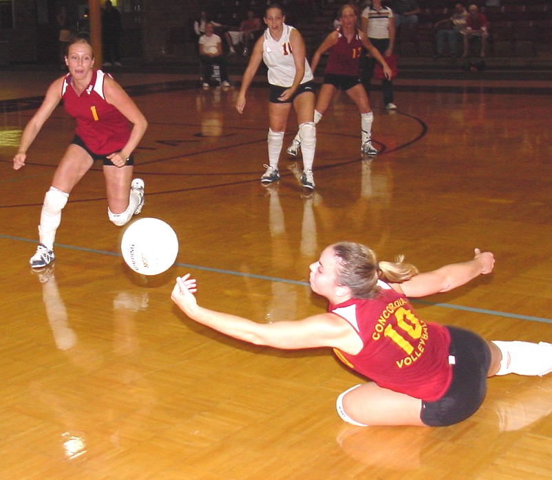 | The Cobber defense holds steady. | A diving Cobber tries for the dig. |