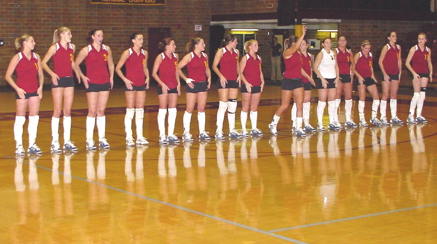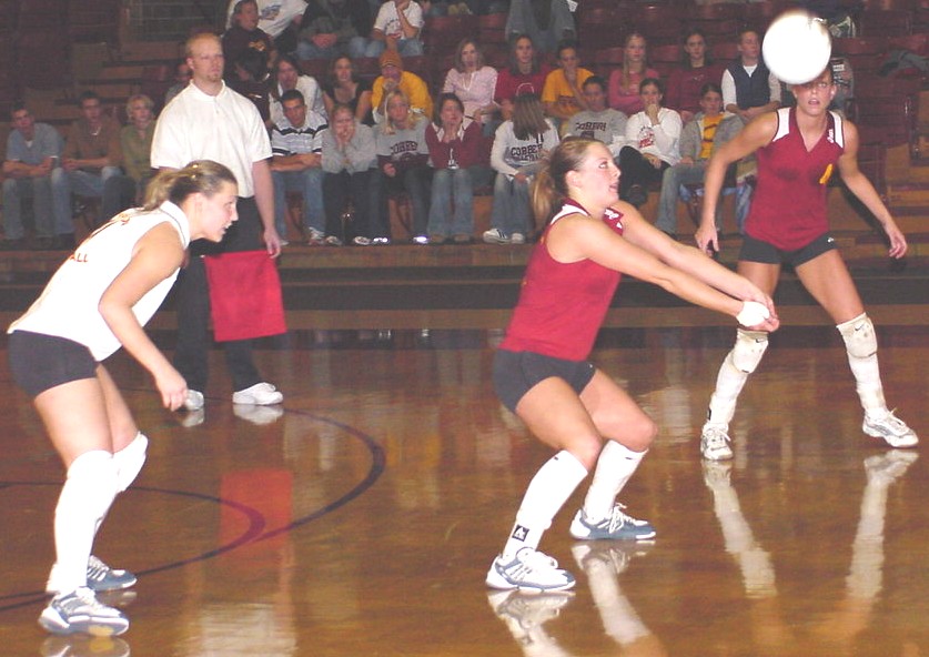 | The Cobbers, psyched and ready, break the huddle just before the match. | Jessica Walden (back) and Becca Shane (front) set the defense as a Carleton player looks for the scoop. |