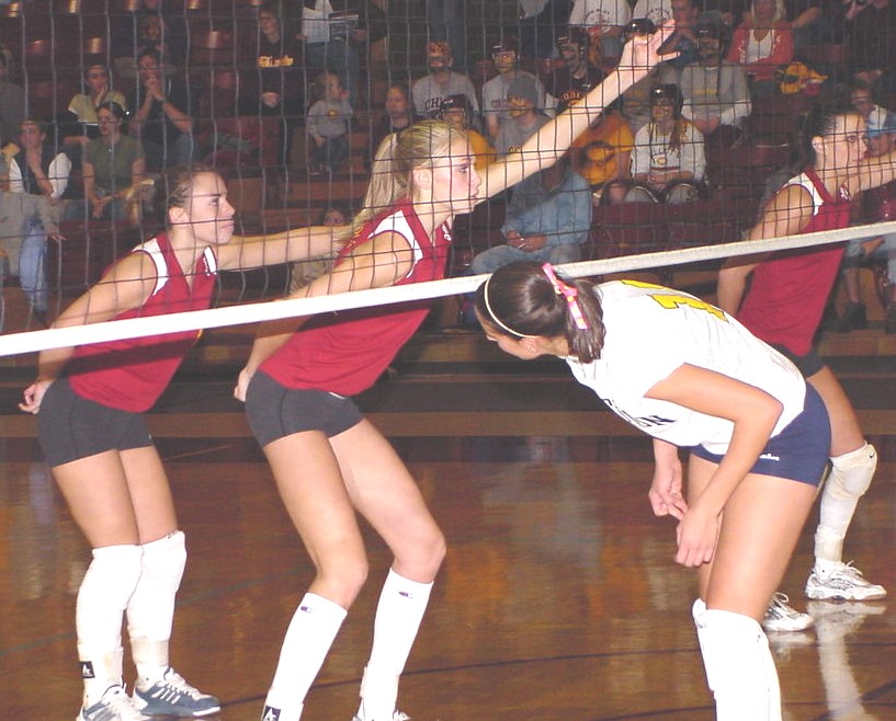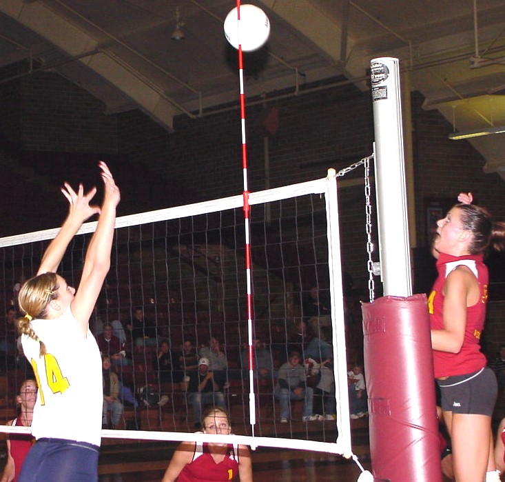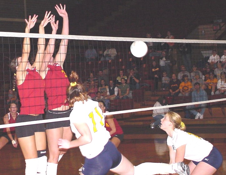 | Kris sather and Jacki Barten with the block. | 3-time All-MIAC player Jacki Barten at the net. |