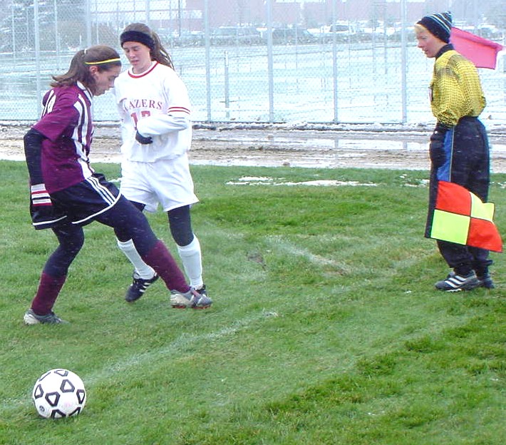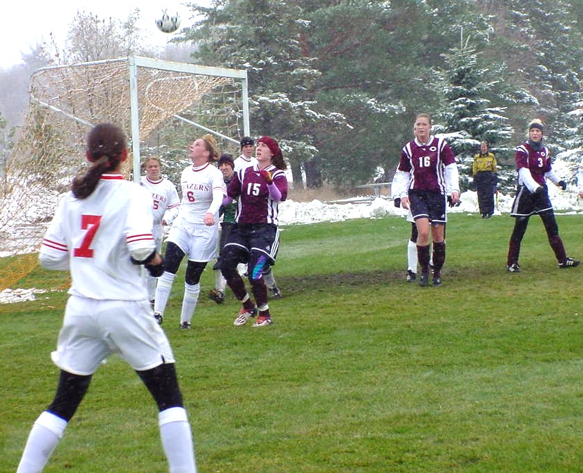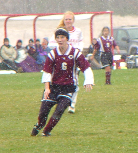 | Morgan Bain kicks the ball of a defender's leg and out of bounds for a Cobber throw-in. | Haley Groce closes in on a Blazer attacker as the snow starts to pick up. |