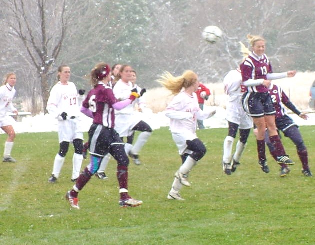| Amy Ravenhorst puts her head into the ball in the middle of the field. |