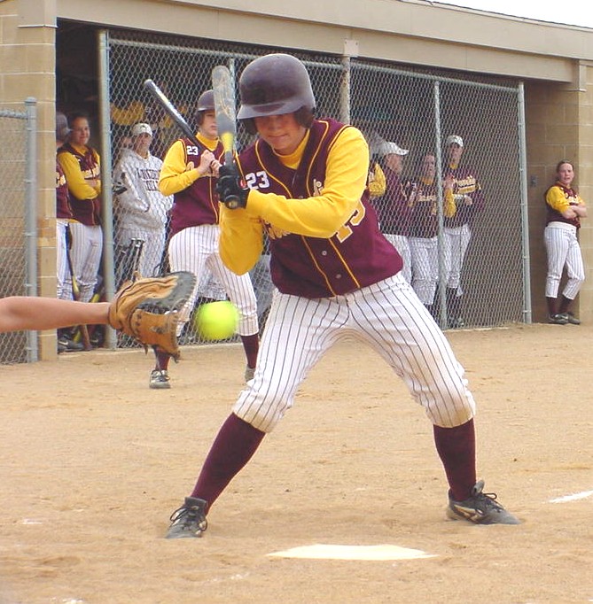 Mandy Pearson watches a pitch sail wide for a ball.