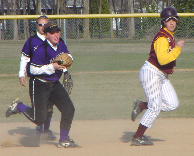 A Cobber baserunner gets caught in a rundown and tagged out.