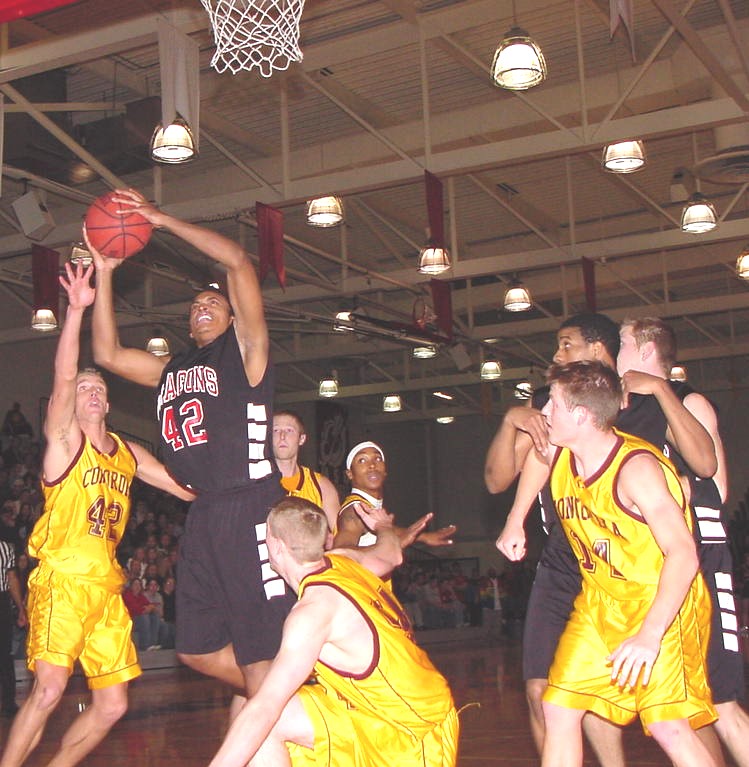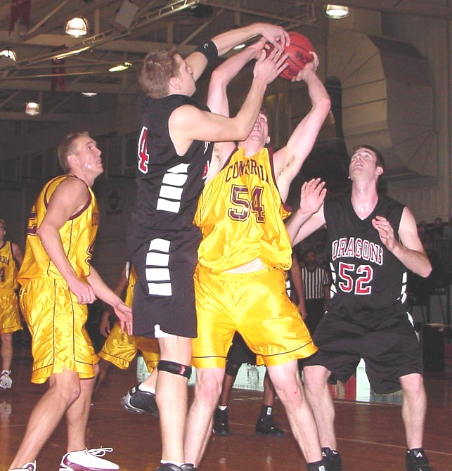 | Keith Eckhoff tries to swat a Dragon layup attempt. | The Cobber inside defense tries to stop another MSU-Moorhead power attack. |