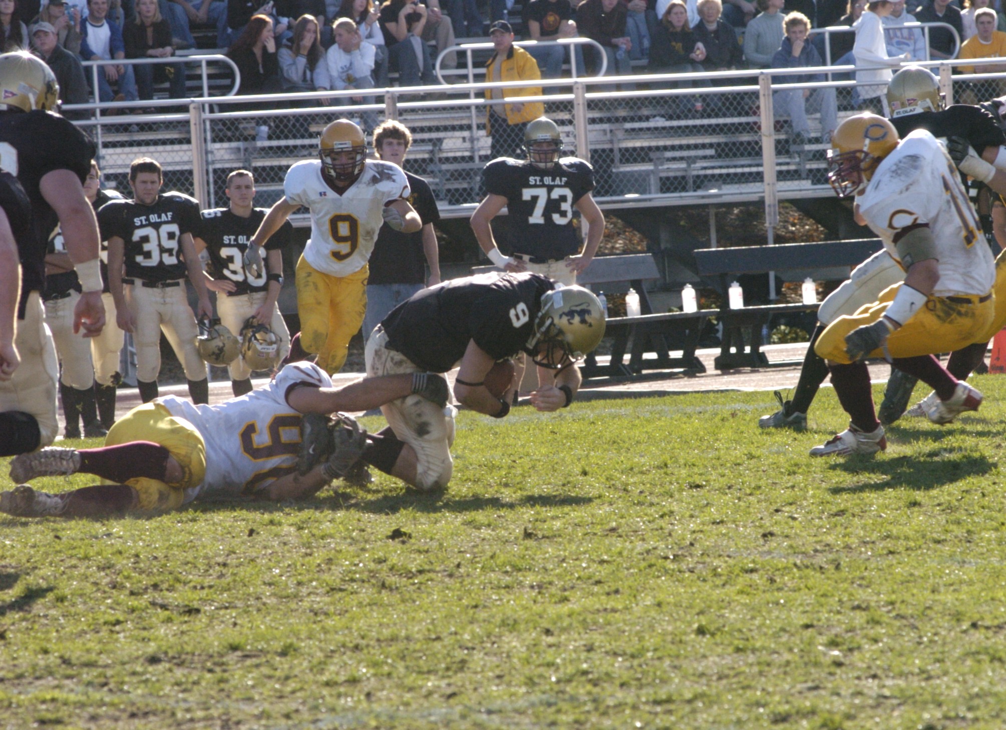Travis Almquist brings down St. Olaf quarterback Jason Wilsey.