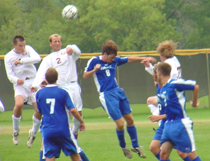 Cobber captain Rick Tungseth (#2) wins the ball off of an offensive corner kick.