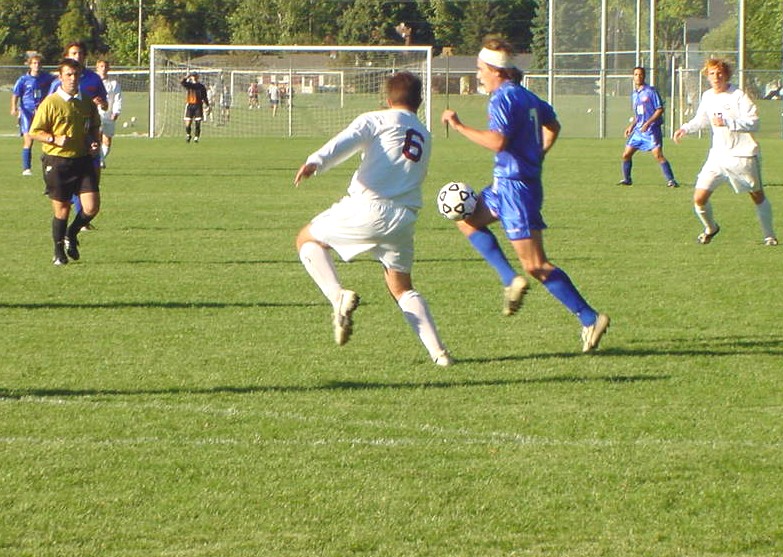 Nate Wahl (#6) plays defense as a Macalester attacker