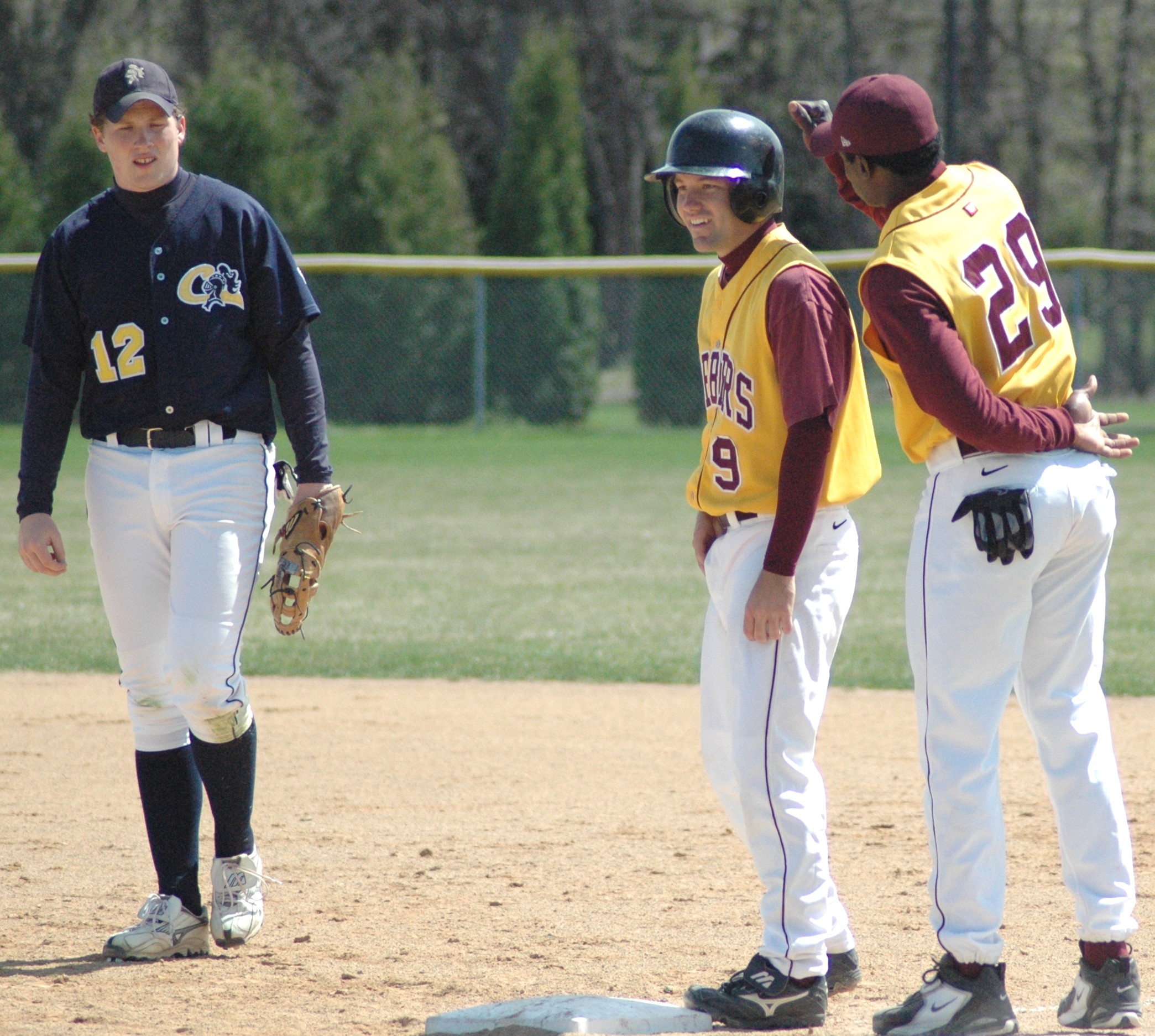 Mathis congratulates Aaron Eckhoff on making it to first.
