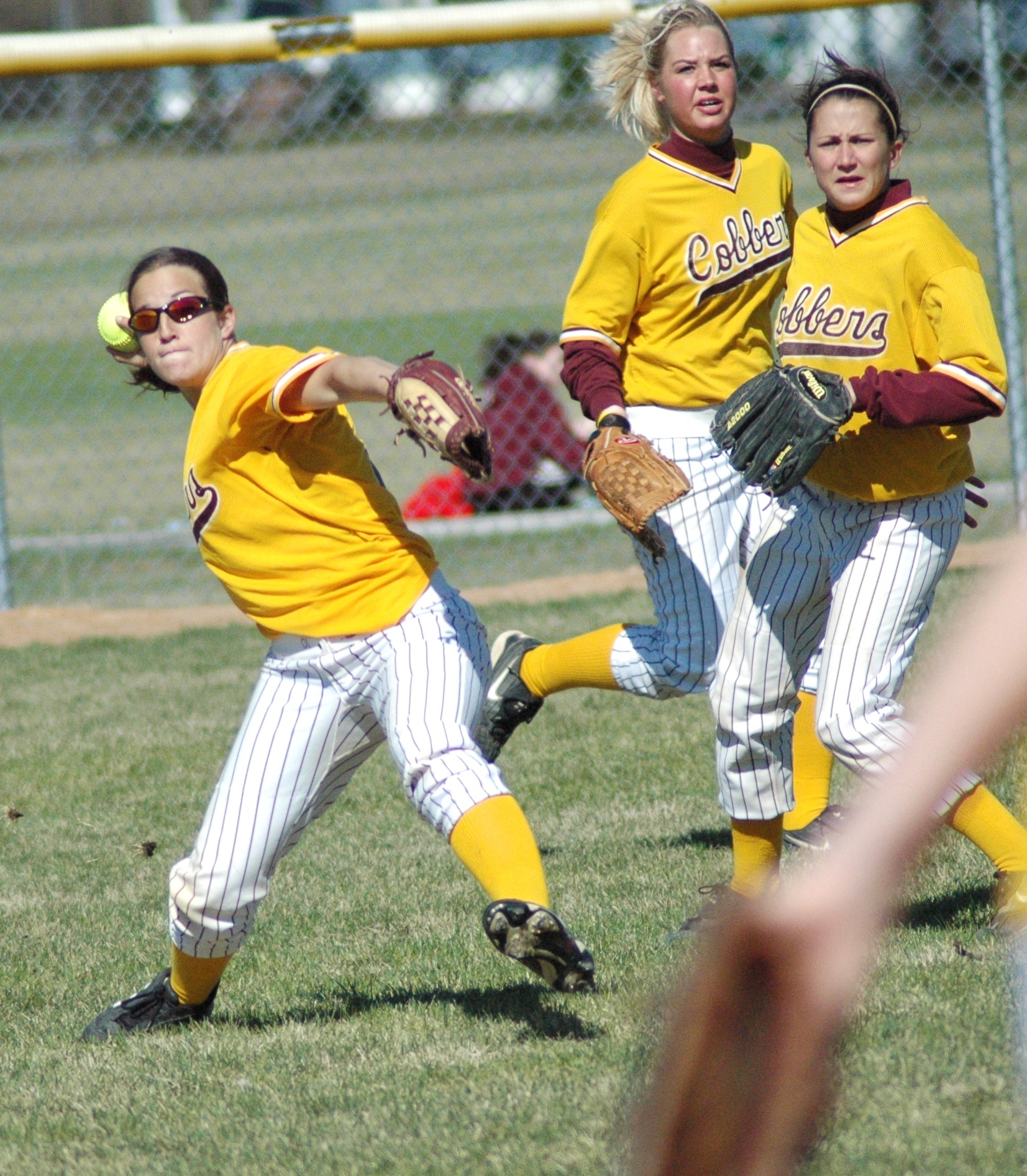 Kelli Niess comes up throwing as shortstop Mandy Pearson (right)