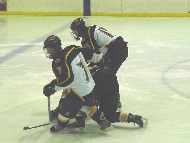 Ronning #7 and Dan Perry #15 sandwich one of the Gustavus