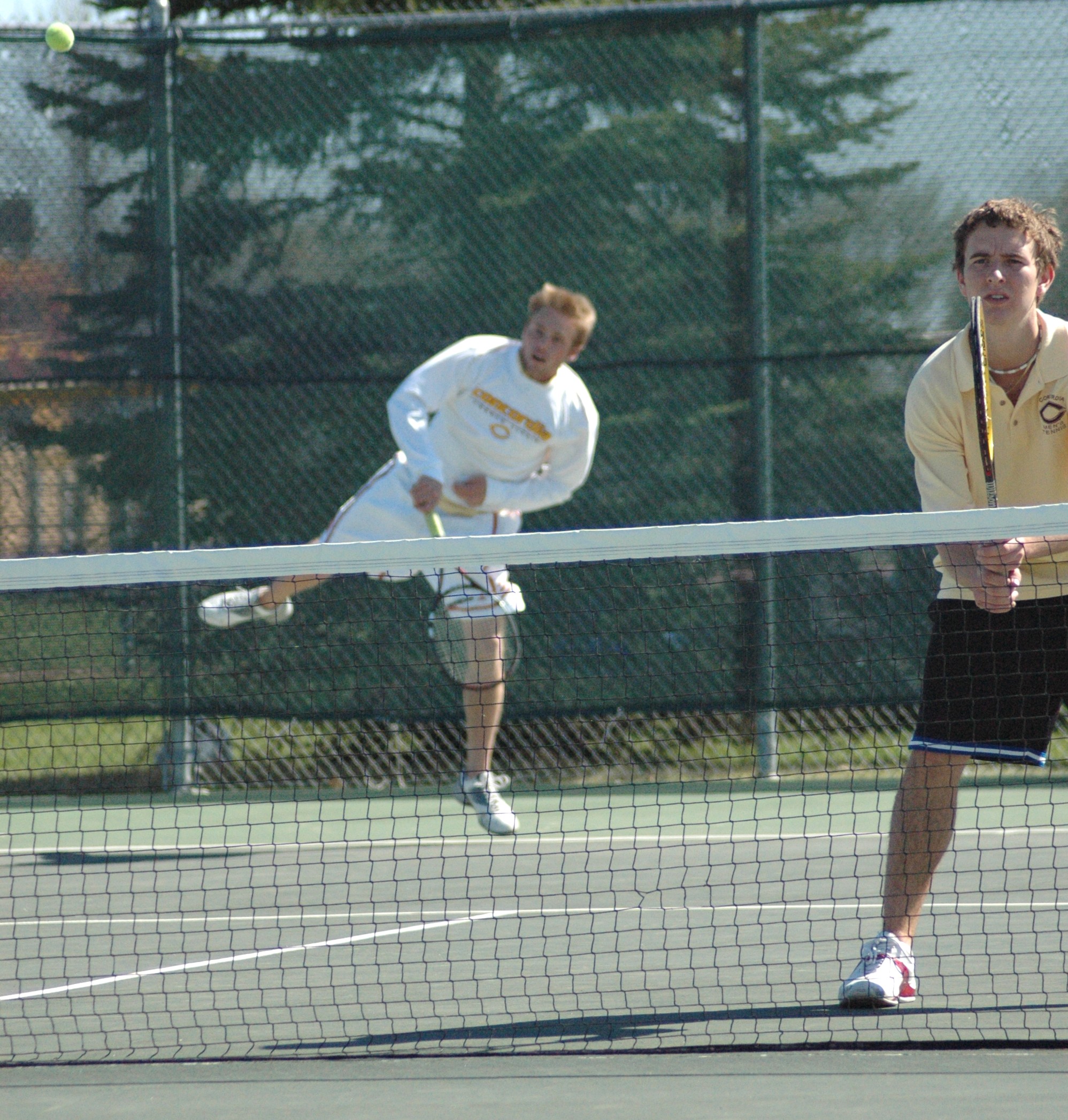 (R) waits at the net unsuspecting that the ball is directly