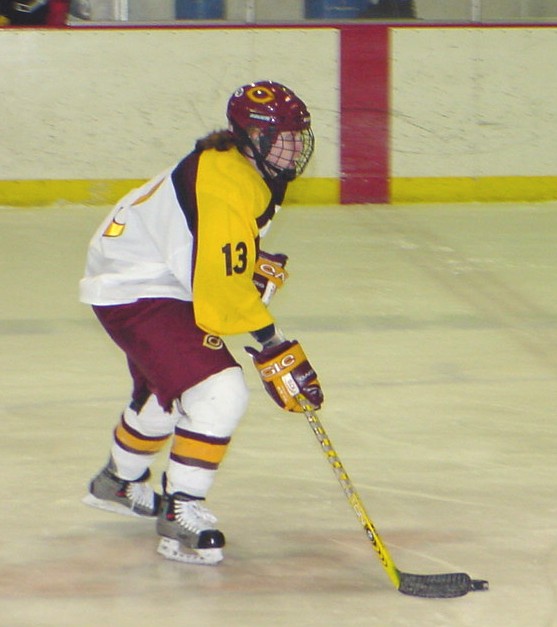 skates the puck through the neutral ice zone.