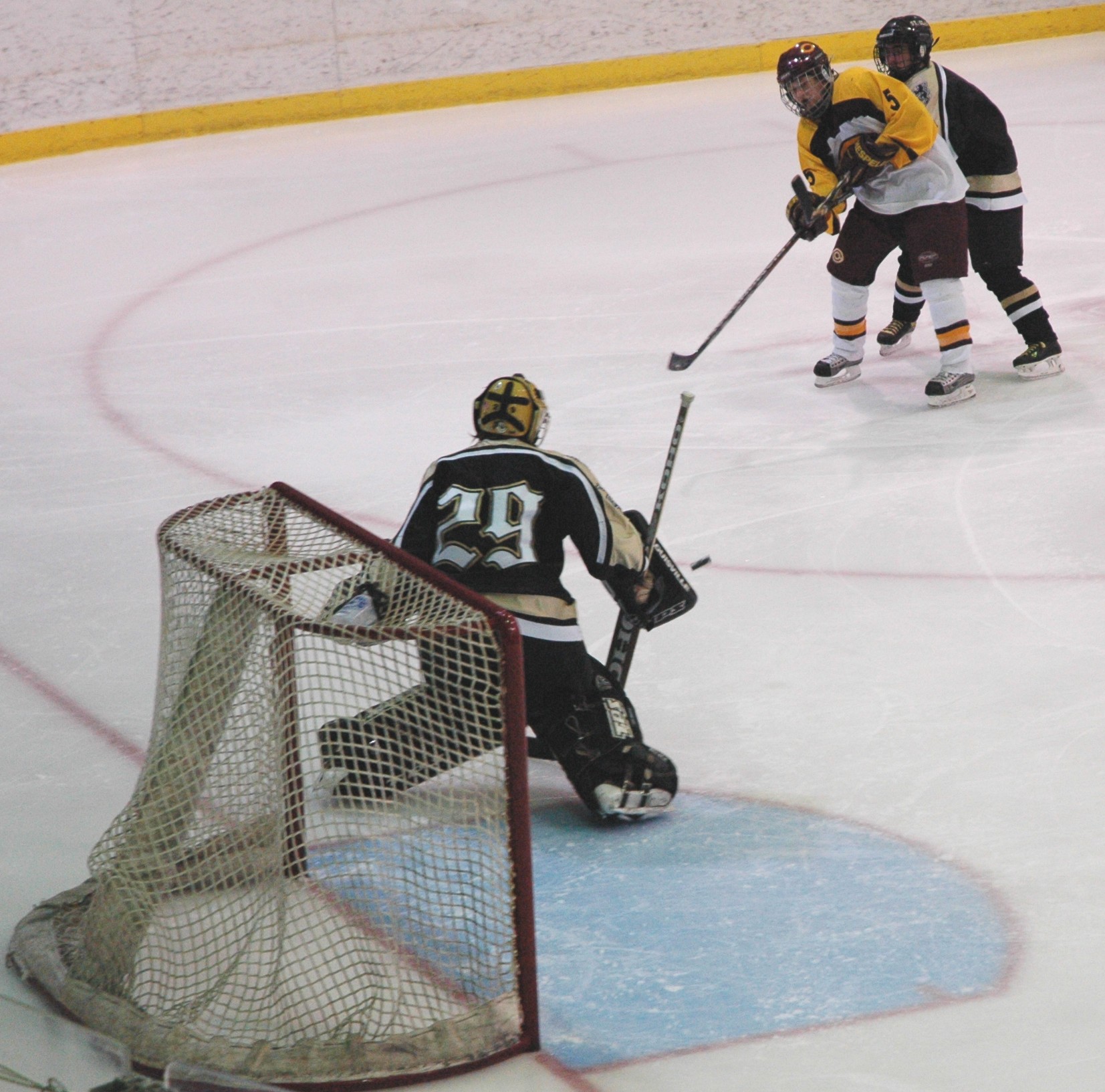 Rachael Hinrichs fires the puck past St. Olaf goalie Kelly Rollwagan