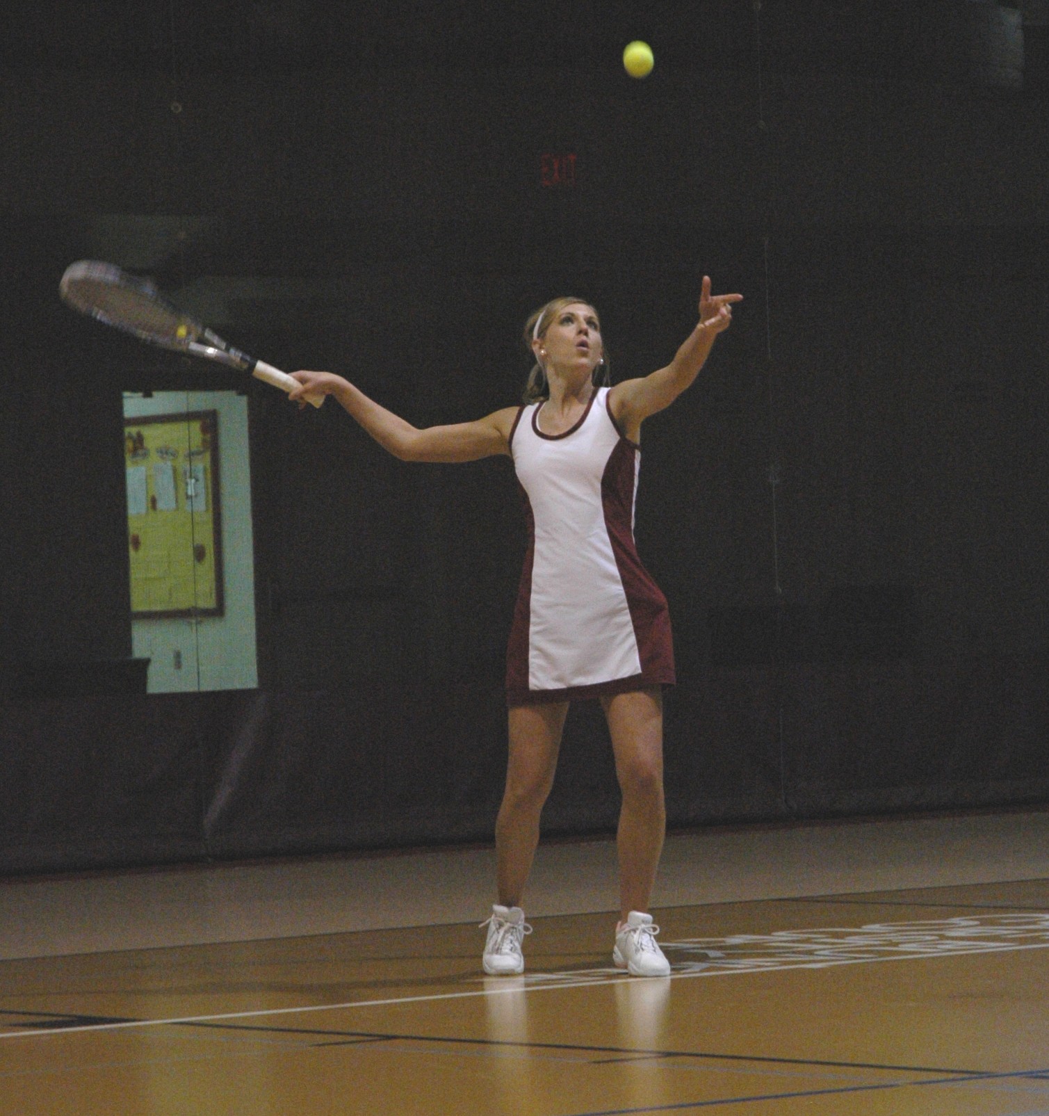 tosses the ball in the air on the serve.