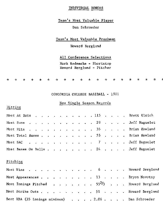 Two Cobbers were named to the all-conference squad pitcher Howard Berglund, a freshman from Carrington, N.D., and shortstop Mark Redemske, a junior from Staples, Minn. Pitcher Dan Schroeder, a junior from Perham, Minn., was voted most valuable player by his teammates.