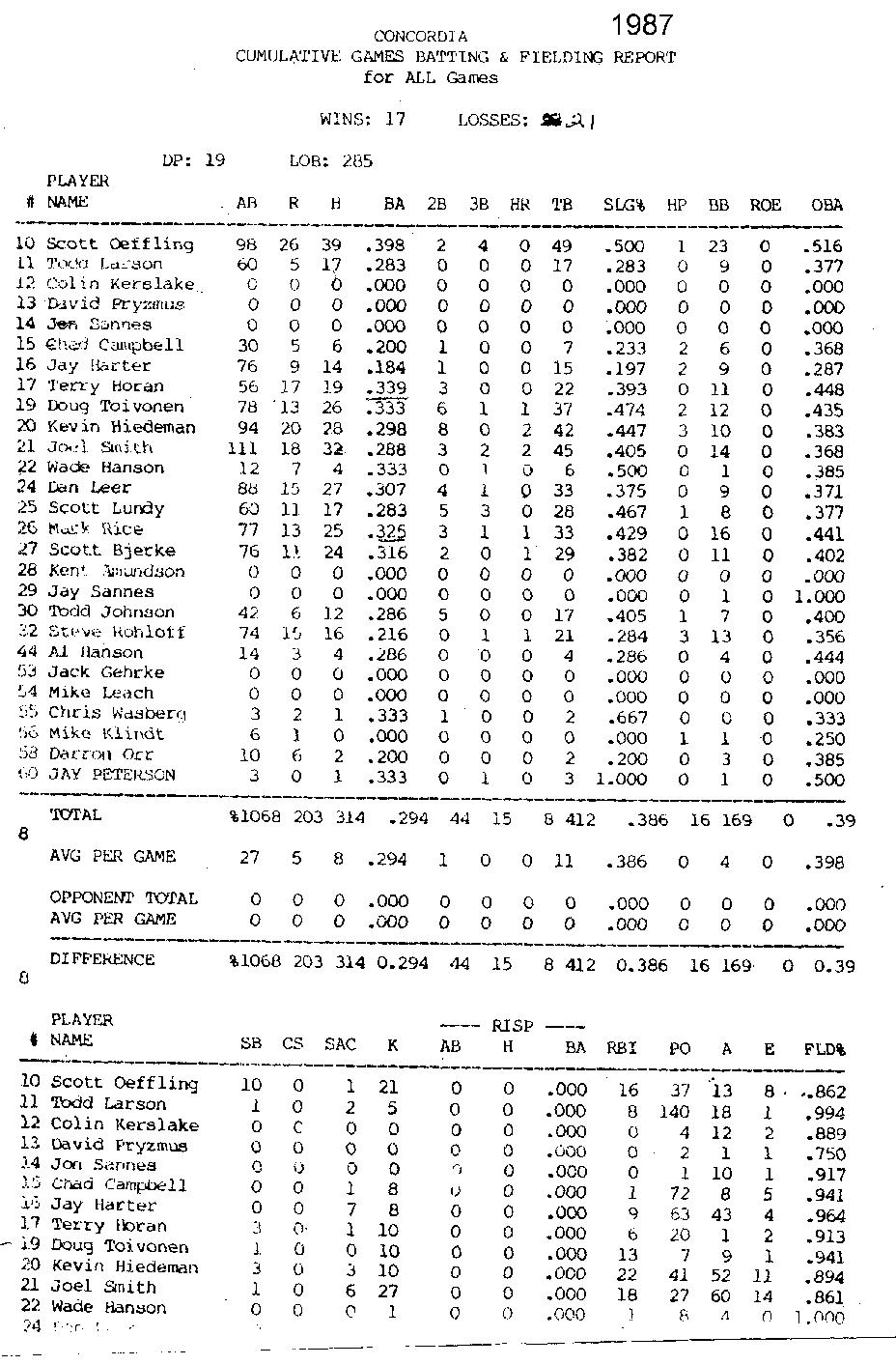 It was a building season for the men's basebaff team as they finished the season in seventh place with their 9-11 Minnesota Intercoftegiate Athtetic Conference and 17-21 overall records. The team led the conference in fielding with a .960 average and batted .294 for the season.