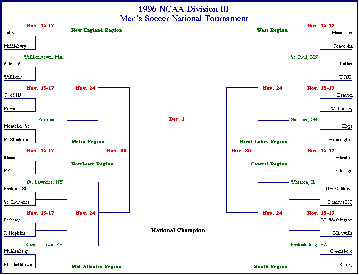 New England region: Middlebury (Vt.) 1, Tufts (Mass.) 0 Salem State (Mass.) 1, Williams (Mass.) 1, (Williams wins 5-3 on penalty kicks)