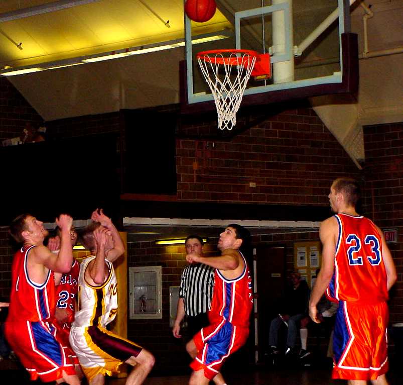| Mike Syverson (#40, Sr., Twin Valley, Minn.) watches his shot in the lane bounce high off the glass. (1/9/02) | Mike Syverson (#40, Sr., Twin Valley, Minn.) comes down after snatching a rebound. (1/16/02) |