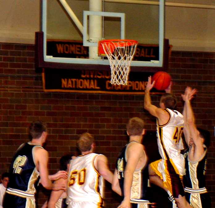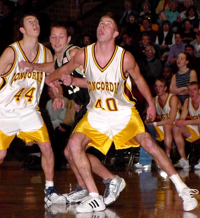 | Mike Syverson (#40, Sr., Twin Valley, Minn.) goes up strong for a layup off the drive. (1/16/02) | Chris Thomas (#44, Jr., Sioux Falls, S. Dak) and Mike Syverson (#40, Sr., Twin Valley, Minn.) combine to shield off an Old player to get position for a rebound. (1/26/02) |