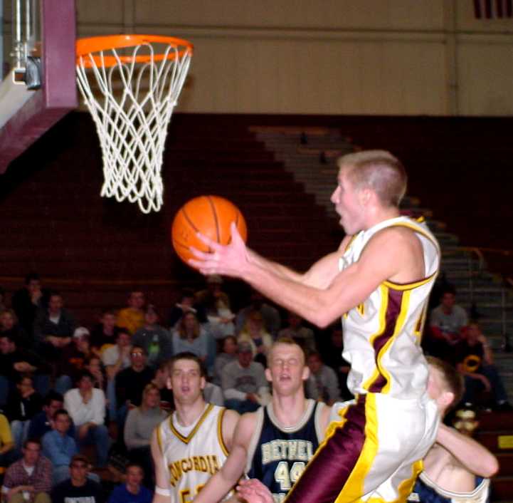 | Mike Syverson (#40, Sr., Twin Valley, Minn.) goes up strong from the baseline, but is denied by the Tommy defense. (2/6/02) |