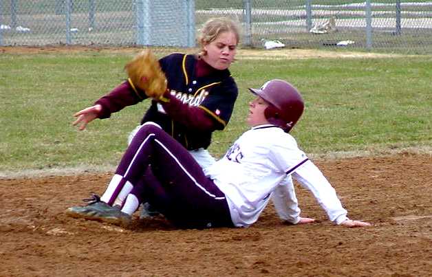 Kathy Braun (Jr., Willmar, MN) tags out an Auggie runner in the second game of the Cobbers MIAC opening series sweep, 4/6/2001. |