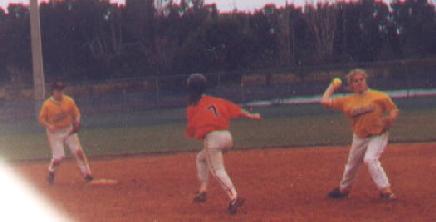 Kathy Braun (Jr., Wilmar, Minn.) turns the 5-4-3 double play in Concordia's doubleheader with St. Thomas, 5/1/2001. |