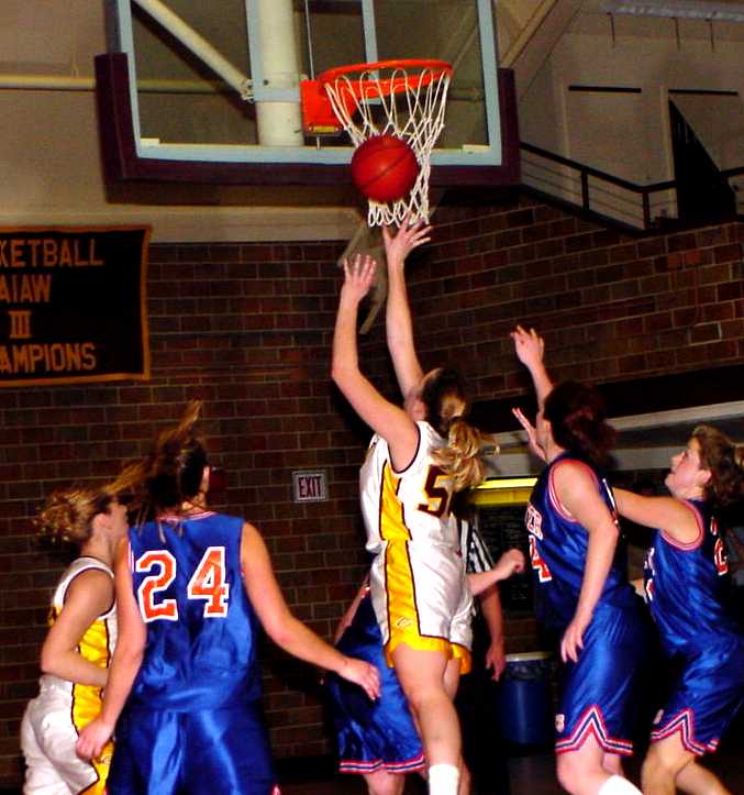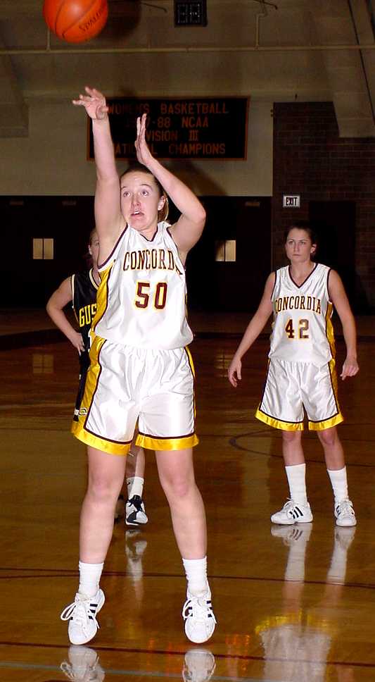 | Kasey Bostow (#50, Jr., Fargo, N.Dak.) follows through on a free throw in the second half. She finished 9-9 from the line, all in the second half. (12/12/01) | Kasey Bostow (#50, Jr., Fargo, N.Dak.) puts up a tough layup in the first half against Macalester. She finished with a team-high 21 points. (1/9/02) |