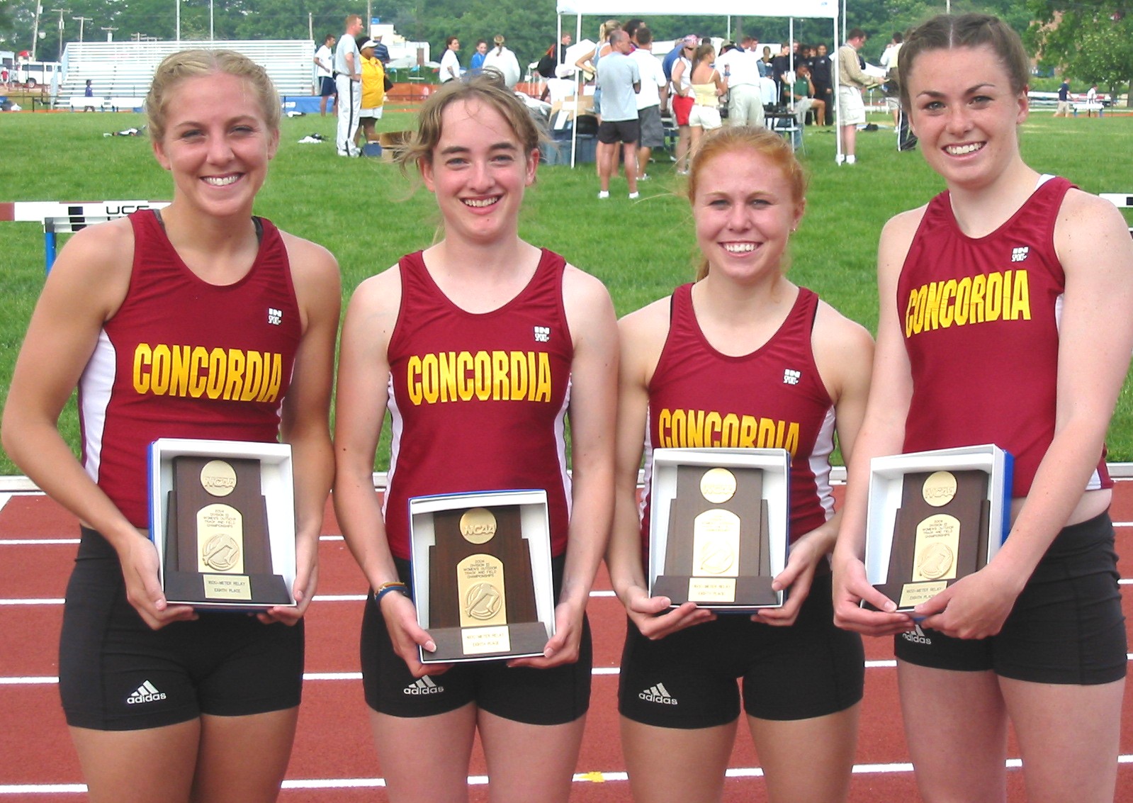 Pfeiffer completed her second successful outdoor national competition as she finished sixth in the 400 meters and then anchored the 4x400-meter relay team that also earned All-American honors. For Pfeiffer it is her third All-American award in her first two seasons at Concordia. Last year she finished seventh in the 100-meter dash and earned All-American status. Pfeiffer was joined by three first-year athletes to capture the All-American award. Alissa Bilden (Fr., Miles, City, Mont./Custer County HS), Amy Ravenhorst (Fr., Hollandale, Minn./Albert Lea HS) and Kelly Olson (Fr., Minot, N.Dak./Minot Ryan HS) all capped a dream-like first year of competition, and laid the ground work for a dominating relay team over the next three years. Plante completed the quintet of Cobber athletes participating at the national meet by competing in the finals of the open javelin. Plante started the day for the Concordia elite by finishing her outstanding season in the javelin. She did not qualify for the final heat, putting up a distance of 124'3" in her preliminary throws. That mark was only five feet from qualifying for the finals. She finishes the javelin season having competed in her second straight national competition, and for the second straight season having broke the Concordia school record in the event. Pfeiffer then opened the day for the track athletes by running a 56.45 in the finals of the 400 meters. That time is the second fastest of her career. She entered the race seeded seventh and as was positioned in the far outside lane. Pfeiffer broke from the starting blocks and was patient for the first 200 meters, letting the competition settle into place. She then finished the race by bolting to a 29.5 over the final 200 meters, and in the process passing the seventh and eighth finishers in the field. She was only .26 seconds away from cracking into the top five, as the fifth place finisher finished in 56.19. Finally, the upstart 4x400-meter team took center stage to ran with the top teams in the nation. The race turned into one of the best events in the entire competition, as six of the eight teams ran faster than the top time in Division III entering the race. The Concordia quartet stayed close throughout the entire race but was unable to make up ground at the end. The Cobbers finished in a time of 3:53.26, which is the fifth straight time they have posted a time faster than the second fastest time in school history entering the 2004 season. In the preliminaries, the relay team narrowly missed a school record when they ran 3:50.82. Despite finishing last in the finals, the Cobbers gave notice to the rest of the field for the years to come, as they were the only squad in the event that did not have a runner older than a sophomore. 5/28 Plante Smashes School Record in